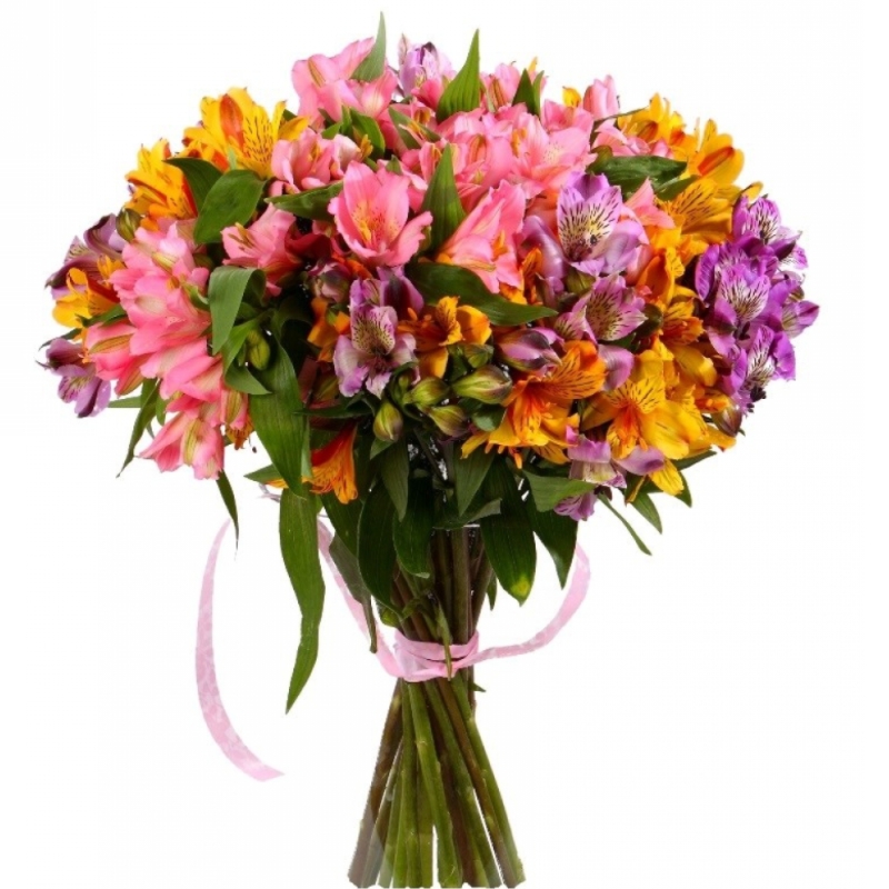 Букет состоит из MIX из 21 альстромерии, зелень, прозрачная упаковка, атласная лента.