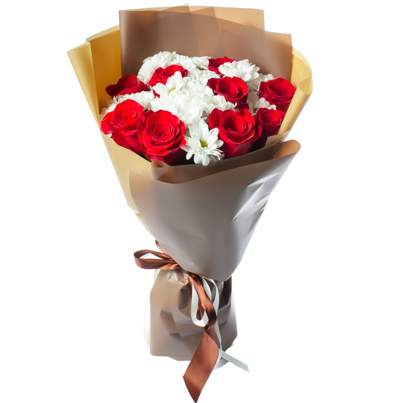 Букет состоит из 9 красных роз, 4 ветки белой хризантемы, крафт.
