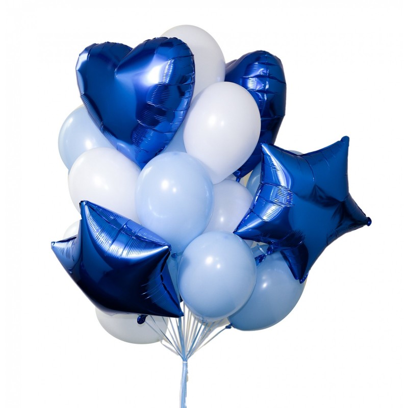 Такой фонтан шаров можно подарить на выписку из роддома или же мальчику в День Рождения. В состав фонтана входят 2 звезды, 2 сердца, 8 белых и 8 голубых шаров.